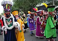 The Chinelos dance is derived from Carnival celebrations in what are now the south of Mexico City, Morelos and the State of Mexico. Since Carnival celebrations allow the wearing of masks for anonymity and behaviors not normally tolerated, a tradition arose for the indigenous to make fun of the Spanish elite and their dress through the dance.[14] The word “chinelos” is derived from the Nahuatl word zineloquie, which means “disguised.”[15] Chinelos dancers wear masks imitating the fair skin and beards of the Spanish along with elaborate dress and gloves.[14] They are the best known Carnival dancers in Mexico with Morelos have the most groups.[15] The Chinelo dancers are now a symbol of the state of Morelos, with the tradition increasing with more towns having dance troupes and it is possible to see troupes dancing at times other than Carnival. It is even possible to hire Chinelos dancers for special occasions.[14] [16]
