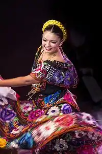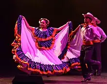 [1]Folk dance of Mexico, commonly known as baile folklorico or Mexican ballet folk dance, is a term used to collectively describe traditional Mexican folk dances. Ballet folklórico is not just one type of dance, it encompasses each region's traditional dance that has been influenced by their local folklore and has been entwined with ballet characteristics to be made into a theatrical production.[2] Each dance represents a different region in Mexico illustrated through their different zapateado, footwork, having differing stomps or heel toe points, and choreography that imitates animals from their region such as horses, iguanas, and vultures.[3]