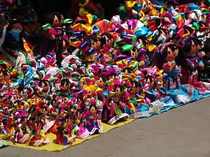 Various types of rag dolls have been made, but the most common have smiling faces, indigenous-like dress, and hair braided with ribbons. They have been called "Marias," but are more often simply called "rag dolls" (muñecas de trapo).[1] Ranging in size from three to forty five centimeters and sometimes more, the dolls can be found for sale just about anywhere in Mexico, especially in tourist venues.[2] Because of this, they have become a symbol of Mexico for foreigners and have been shipped outside of the country, primarily to the United States, Canada and South America.[3]