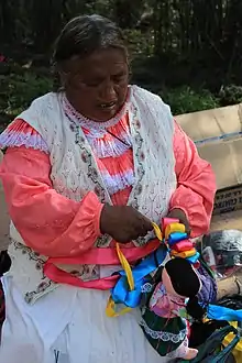 The most authentic of the dolls are made by hand and/or sewing machine in homes or small workshops, mostly by women but sometimes men and children participate.[5][6] Most of the materials are commercially-made, such as fabric and buttons, but the most traditional filling is a local fiber called guata.[1] Although the ribbon-adorned version with the wide face is by far the most popular, other variations have come about such as dolls representing Frida Kahlo and those made with more ecological materials.[9][6] In 2014, the state of Queretaro filed paperwork to seek "denomination of origin" for the dolls to have only those made in southern Queretaro as authentic, but this was denied, principally because the dolls are primarily made with non-local materials.[2][10][6]