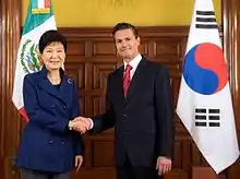 Mexico–South Korea relations are the bilateral relations between Mexico and South Korea. There are an estimated 15,000 Koreans and Mexicans of Korean descent living in Mexico.[1] Both nations are members of the Asia-Pacific Economic Cooperation, G-20 major economies, Organisation for Economic Co-operation and Development and the United Nations.