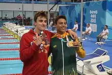 ![]() Michael Houlie (right) and Alexander Milanovich with their 2018 Summer Youth Olympics medals in the 50-meter breaststroke | ||||||||||||||||||||||||||||||||||||||||||||||||