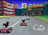 A screenshot of the Nintendo 64 version showing a race in Indianapolis, with the player controlling Mickey Mouse.