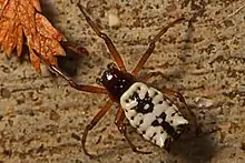 Micrathena mitrata, the white micrathena, is a species of orb weaver in the spider family Araneidae. It is found in a range from the United States to Brazil.[1][2][3][4] The spider has a distinctive appearance with a shiny, black abdomen and spiky, yellowish-brown legs. Its body length ranges from 4 to 9 mm in females and 3 to 4 mm in males.[5][6] The species is known for its elaborate web, which it uses to capture insects for food. Despite its fearsome appearance, Micrathena mitrata is not considered dangerous to humans and is generally regarded as a harmless spider.[6]
