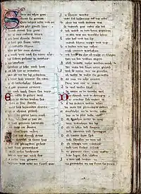 The Ezzolied (before 1064),[60] the first literary work of the MHG period, is a strophic work of salvation history from the Creation to the Crucifixion.[61] The other poems from the first century of this period are likewise designed to present biblical material to a lay audience, and range from "biblical ballads" — short poems on individual biblical episodes — to longer retellings of complete Old Testament books.[62] Many of these are collected in manuscript compilations, of which the most notable is the Vorau manuscript, with a dozen Biblical pieces. This includes poems by Ava, the earliest known female poet writing in German.[63][64]