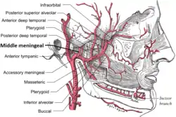 The middle meningeal artery (Latin: arteria meningea media) is typically the third branch of the first portion of the maxillary artery. After branching off the maxillary artery in the infratemporal fossa, it runs through the foramen spinosum to supply the dura mater (the outer meningeal layer) and the calvaria. The middle meningeal artery is the largest of the three (paired) arteries that supply the meninges, the others being the anterior meningeal artery and the posterior meningeal artery.