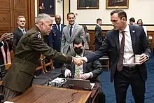 As chairman of the House Armed Services Committee subcomittee for cyber programs, Representative Mike Gallagher greets Army Gen Paul Nakasone, March 2023