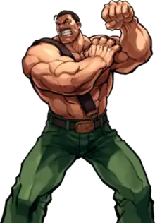 Beyond the Final Fight series, Haggar appears as a playable character in a prequel series, Saturday Night Slam Masters and its two sequels, Muscle Bomber Duo and Ring of Destruction: Slam Masters 2.[10] He was also intended to appear in the canceled 3D fighting game Capcom Fighting All-Stars as a selectable character, reprising his role as mayor to save Metro City from a bomb attack.[11] He also appears as one of several playable characters in the crossover game Namco × Capcom, and as a character card in each of the SNK vs. Capcom: Card Fighters Clash titles. Haggar appears as the only playable Final Fight character in the crossover fighting games Marvel vs. Capcom 3: Fate of Two Worlds, Ultimate Marvel vs. Capcom 3, and Marvel vs. Capcom: Infinite.