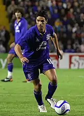 Arteta signed with Arsenal on 31 August 2011 on a four-year deal for a reported fee of £10 million.[28] He made his debut on 10 September in a 1–0 home win against Swansea City,[29] and scored his first Premier League goal for Arsenal in a 4–3 loss against Blackburn Rovers at Ewood Park.[30] Arteta got his first chance to captain the Gunners in the third-round FA Cup victory over Leeds United, a game in that marked the second Arsenal debut of Thierry Henry. Arteta suffered an ankle sprain in his side's 2–1 loss to Wigan Athletic on 16 April, which sidelined him for the remainder of the season.[31] Despite this he made 29 appearances all season, scoring 6 times, and was voted by the fans as the fifth most important player of the 2011–12 campaign in Arsenal's Player of the Season poll.[32]