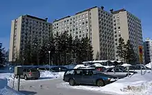Mikontalo was built during the period 19781980.[1] Representing brutalism, it consists of 4 blocks with 12 floors where 767[2] dwellings are situated. Mikontalo offers for its inhabitants saunas (two per building), a free gym, public lounge with a TV-set, Nintendo Wii, Soundsystem, board games, coffee machine and microwave; laundry room (5 washing and 2 drying machines), cable TV, and connection to the Internet.[1]