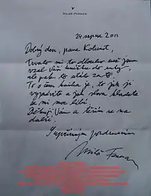 A letter by Miloš Forman to Milan Kohout in which he speaks highly of Kohout's book.