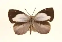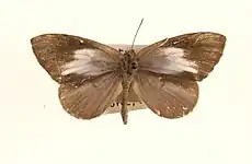 The female has the upperside forewings of dark brown; base shaded with greyish brown; the white median patch as in the male, but very much larger, its upper margin irregularly curved; it is spread over the anterior two-thirds of the cell, extends beyond it into the bases of interspaces 4, 5 and 6, and below the cell it occupies the basal four-fifths of interspaces 1 and 2. Hindwing: costal margin broadly dark brownish; wing posteriorly from below the subcostal vein and vein 6a beautiful pale bluish-grey; a broad whitish streak beyond the cell not reaching the termen. Underside, forewing: the median white patch as on the upperside but larger, extending to the dorsal margin and base of cell; base of wing, costal margin above the sub-costal vein and conjoined upper discal obliquely-placed patch greyish brown; apex of wing whitish, termen between veins 1 and 6 broadly stained with rusty; a conspicuous rusty pretornal spot; some obscure white-margined spots at base of cell and along costa, and a transverse sub-terminal series of black dots. Hindwing: pale ochraceous white, darkening to rusty brown towards the middle of the termen; a subbasal, a median and a discal transverse incomplete macular brown band, each spot in the bands margined on the inner and outer sides by slender black lines; finally a subterminal transverse series of short slender black threads. Antenna, head, thorax and abdomen as in the male.[5]