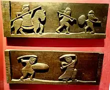 Pattern of warriors fighting on a fragment of jar. Brown glazed ceramic, Trần dynasty, 13th - 14th century.