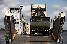 U.S. Marines from Combat Logistics Battalion 8 and Navy personnel from Beach Master Unit 2 off-load ISO containers from a Landing Craft Utility with a Logistics Vehicle System Replacement