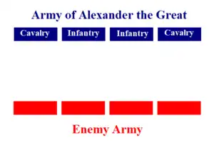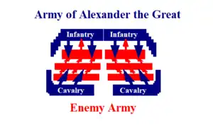 Attacking from the flanks, the Macedonian cavalry surprised the enemy troops by the speed and force of its impact; in the center, the phalanx and the hypaspists advanced to open the second front. Once the enemy's way was closed, it was left in a trap. Generally, this caused great confusion because it could not be distinguished whether the units were dispersed or just poorly coordinated.