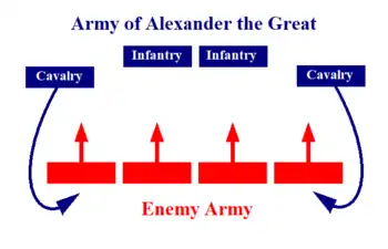 The tactical use of this cavalry was based on the Achilles heel of the phalanxes. Their vulnerability in the flanks and rearguard—it was practically impossible to pivot to stop a flank and rearguard attack due to the hindrance of the sarissas.[6] The destructive effect of the phalanx was due to the cohesion of the hoplites during the impact, a cavalry attack from the flanks or from the rearguard was likely to disorganize the formation and make it vulnerable during the impact against another phalanx. It was the combination of phalanx and cavalry in the tactics of the hammer and the anvil that provided the decisive tactical advantage to the armies of Alexander the Great and that was the basis of the conquest of his immense empire.