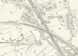 The railway line was built by the Edgware, Highgate and London Railway (EH&LR) and was opened on 22 August 1867, in what was then rural Middlesex, by the Great Northern Railway (GNR) (which had taken over the EH&LR). The station, then named The Hale Halt, was not opened until 11 June 1906, on the single track from Finchley Central to Edgware.[1] The whole line ran from Finsbury Park to Edgware via Highgate with branches to Alexandra Palace and High Barnet. The station was adjacent to the Midland Railway's (MR's) Mill Hill station (now Mill Hill Broadway), with the GNR's track passing under those of the MR just to the south of Mill Hill station. A goods service opened on 18 July 1910.[1]