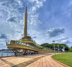 Millennium Monument (Malay: Monumen Alaf Baru) is a national monument in Putrajaya, Malaysia which is analogous to the Washington Monument in Washington DC, United States. It was the second national monument to be built in Putrajaya after Putrajaya Landmark. It is shaped like an obelisk with etchings denoting important periods and milestones in the nation's history. The monument is 68m tall. It stands in a 25-hectare park in Precinct 2. The monument is constructed of solid metal structures. At night, the monument serves as a beacon with strong light projected at 360 degrees and sweeping lights visible from various locations in Putrajaya. The lights also guide the cruise boats.