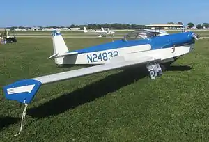 It was a generally conventional, low-wing cantilever monoplane with a cockpit enclosed by a bubble canopy. The undercarriage, however, was a manually retractable monowheel with a tailskid behind it.[2] The fuselage was of wooden construction, covered in plywood and fibreglass, while the wings and tail were built of wood and covered in fabric.[3]