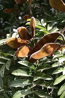 A semi-deciduous tree from 10 – 25 m tall. The stem is usually twisted or bent and often branches low down. The bark is smooth on younger branches and flaky on older branches and stems. The colour of the bark is pale brown to pale grey-brown,[2] with some stems appearing reddish where stained by soil from termites. The compound leaves have 3 to 7 pairs of opposite, lance-shaped leaflets and one terminal leaflet. The leaflets are 20 – 50 mm long and the leaves are up to 250 mm long overall. The leaves are glossy dark green or blue-green above, and yellow-green beneath. Fine silky hairs are present on the undersides of the leaves and on the midrib. Older leaves turn yellow and these trees lose most of their leaves in the drier months (winter), but they are soon replaced by new leaves which are reddish-brown and velvety at first. The flowers are similar to those of wisteria, and are described as mauve, lilac or purple in colour. The fruits are flat, woody pods up to 150 x 40mm and covered with a velvety layer of reddish to golden brown hairs. The pods split (often with a loud popping noise) when dry to release flat, oblong seeds which are easy to grow in fine sandy soil.[3]