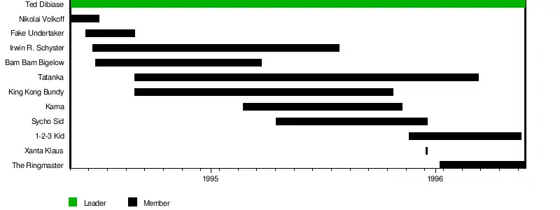 DiBiase added Sycho Sid after Sid turned on Shawn Michaels following WrestleMania XI,[7] and later added The 1-2-3 Kid during Sid's feud with Razor Ramon.[1] However, one by one the Million Dollar Corporation began to disband as its members found themselves out of work. Bundy and IRS left the WWF in 1995, while Kama and Tatanka lasted until early 1996.[1] The 1-2-3 Kid lasted until May 1996, while Sycho Sid entered a temporary retirement due to a severe neck injury.[1] During the 1995 Christmas season, DiBiase added Xanta Klaus, a twisted take on Santa Claus, who hailed from the South Pole and reveled in taking from people rather than giving. However, the character lasted only a few appearances before being dropped. DiBiase, with nobody left to manage, was paired with former WCW star Steve Austin, who was given the name "The Ringmaster" and awarded the Million Dollar Championship by DiBiase, who also taught Austin his finishing move, the Million Dollar Dream.[1] Although "The Ringmaster" name was dropped quickly and Austin adopted the "Stone Cold" moniker he later made famous, he continued to be managed by DiBiase and regarded as the Million Dollar Champion.[1]