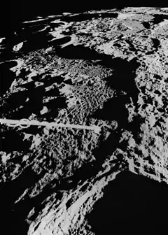 Oblique view facing south, from Apollo 15. Spacecraft's gamma-ray spectrometer is at left.