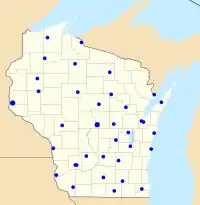 Map of radio affiliates in 2017; note the map consists of data for stations by location of transmitter, thus WTMJ's location being in Racine County near Union Grove rather than Milwaukee.