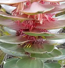 The inflorescence is broadly cylinder-shaped, 8–15 cm (3–6 in) long and 10–12 cm (4–5 in) in diameter, crested by smaller silvery pink leaves at an upright angle. These consist of many flower heads, each containing six to nine individual flowers and are set in the axil of an ordinary, flat leaf flushed mauve to carmine, particularly at its base. The outer whorl of bracts that tidely envelop the flower heads, are initially cartilaginous in consistency, becoming woody with age, carmine in colour, bluntly oval in shape, ¾–1½ cm (0.3–0.6 in) long and ½–¾ mm (0.2–0.3 in) wide, with a powdery outer surface a row of minute hairs along the edge. The bracts on the inside of the head are narrow, 1–1¼ cm (0.4–0.5 in) long and about ¼ cm (0.1 in) wide, and densely set with silky hairs.[4]