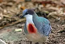 The Mindanao bleeding-heart (Gallicolumba crinigera), also known as Bartlett's bleeding heart dove, Barlett's bleeding heart pigeon and the hair-breasted bleeding heart, is a species of bird in the pigeon family. It is endemic to the Philippines on the islands of Mindanao, Basilan, Samar, Leyte and Bohol. It is so named because of a red blotch on its breast. The generic name derives from a fusion of the Latin gallus ("chicken") and columba ("pigeon").