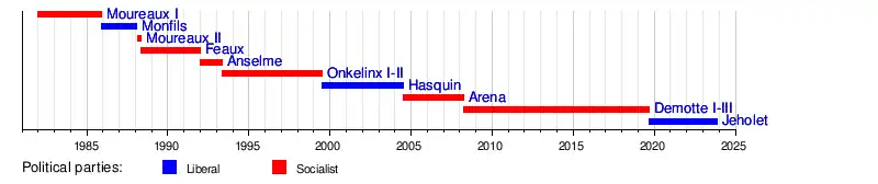 13 September 2019 Incumbent 4 years, 122 days MR Jeholet II PS, MR, Ecolo