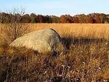 The park's flat prairie area is a terrace of the ancient river. The Dakota name is Tinta inya ota, meaning "prairie with many rocks", because it is studded with numerous glacial erratics. These boulders were carried far from their northern sources by ice over 15,000 years ago. The soil is quite thin over limestone bedrock.[10]