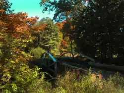 The Minortown Road Bridge is located in a rural setting of northeastern Woodbury, just south of US 6. It is oriented roughly north-south across the Nonewaug River, which is flanked by US 6 to the north and Minortown and Mill Roads to the south. The bridge is a single-span wrought iron lenticular truss, 64 feet (20 m) long. The trusses are mounted in concrete abutments land on top of the original rubblestone abutments. They no longer carry the active load of the single lane of traffic, which is now supported by a modern timber beam bridge what was built between the two trusses.[2]