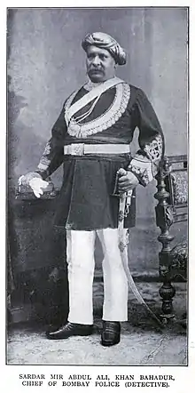 Mir Abdul Ali (August 1840[1] – 14 June 1906, service in the Bombay Police from 1865 to 1903) with the titles of Khan Bahadur and Sardar, was an Indian police detective who served with the British Police Force in Bombay City. His father Akbar Ali had also served in the police force and had earned a reputation for solving crimes and had retired with high honours. Abdul Ali continued in the tradition and was once known as the Sherlock Holmes of India.