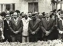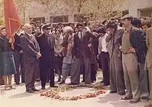 Communist PDPA members at the funeral of Khyber in Kabul, front row left to right: Anahita Ratebzad, Dr. Shah Wali, Sulaiman Layeq, Babrak Karmal, Nur Muhammad Taraki and Mohammad Najibullah.
