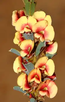 Mirbelia seorsifolia is a species of flowering plant in the family Fabaceae and is endemic to the south-west of Western Australia. It is an erect, open shrub that typically grows to a height of 15–70 cm (5.9–27.6 in) and has yellow and red flowers from August to December. It grows on sandplains in the Avon Wheatbelt, Coolgardie, Great Victoria Desert, Murchison and Yalgoo bioregions of south-western Western Australia.[2] The species was first formally described in 1876 by Ferdinand von Mueller, who gave it the name Gastrolobium seorsifolium in Fragmenta Phytographiae Australiae.[3][4] In 1943, Charles Gardner changed the name to Mirbelia seorsifolia in Enumeratio Plantarum Australiae Occidentalis.[5] The specific epithet (seorsifolia) means "separate leaves", referring to the well-spaced leaves.[6] Mirbelia seorsifolia is listed as "not threatened" by the Government of Western Australia Department of Biodiversity, Conservation and Attractions.[2]