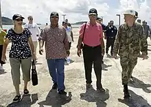 US Navy 080825-N-0209M-009 The Honorable Manny Mori, left, The Honorable Miriam K. Hughes, The Honorable Governor of the Federated States of Micronesia Wesley Simina, and EOC James Brock walk together during a tour of an Engineering Civic Action Program