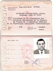 Miroslav Štěpán (5 August 1945 – 23 March 2014) was a Czechoslovak politician. He was a member of the Communist Party of Czechoslovakia. He was the Secretary of the Municipal Party Committee in Prague and member of the Central Committee of the Communist Party of Czechoslovakia. He was born in Louny.