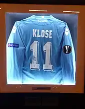 Klose signed a three-year contract with Italian Serie A club Lazio on 9 June 2011.[31] He scored his first goal for Lazio in the 2011–12 UEFA Europa League play-offs and also assisted four other goals. Lazio won that match 6–0 and won the play-off 9–1 on aggregate against Rabotnički.[32] On 9 September 2011, he made his Serie A debut in a 2–2 draw against Milan and scored a goal in the 12th minute, which was the first Serie A goal of the season. Despite having been at the club for only a few months, Lazio coach Edoardo Reja underlined his importance to the team.[33] On 16 October 2011, Klose scored in the 93rd minute to win the Rome derby against Roma for Lazio, 2–1. However, the occasion was tainted by a small section of radical Lazio fans holding a sign adapted from a motto used by the Nazis. The sign read "Klose mit uns", which means "Klose with us". It was intended by those fans as praise for Klose; however, the Nazis used the motto "God with us" and the Lazio fans' sign featured the S's in the same font as the logo of Adolf Hitler's Schutzstaffel (SS). Klose had explicitly condemned the sign, saying, "[P]olitics should stay out of the stadium."[34][35][36]