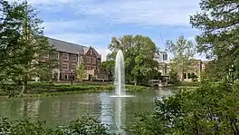 Historically, the lake was spring-fed, and sat on the property of William Neil. The trustees in charge of purchasing land for the new Ohio Agricultural and Mechanical College, which would later become the Ohio State University, chose to purchase Mr. Neil's land after drinking from the spring.[2] The spring dried up in 1891 when the city of Columbus struck the source of the spring while installing a sewer line through campus.[3] Between 1891 and 1972, the lake was filled using water from the Olentangy River. The water source was subsequently provided by the city of Columbus municipal water supply, at a new location on campus near the location of the original lake.[4]