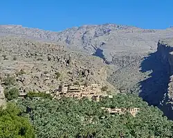 Located in an oasis at 900 m a.s.l. in the Western Hajar mountains, it has an extensive falaj water canalization system which dates back more than 2000 years.[2] It is still in use nowadays to supply the village with water from a local spring, and to irrigate the terraced fields where crops such as mangoes, pomegranates, figs, and olives are grown.[3]