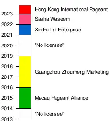 Later in 2023, the license was transferred to the Hong Kong International Pageant (Chinese: 香港國際選美), a newly established organization chaired by former Miss Grand Hong Kong, Chan Mei To (陳美濤).[12] The representative for this particular year was elected through the audition process.[8] In addition to Miss Grand International, the new organization also holds the Hong Kong franchise of another international pageant, Miss Supranational.[12]