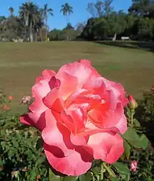 The A.C. Postel Memorial Rose Garden is an accredited show garden of the All-America Rose Selections (AARS).[6] The garden was initiated in 1955 with a donation of 500 pedigree rose bushes. In 1959, the non-profit Santa Barbara Rose Society was established.[7] By 1961 the condition of the rose garden had deteriorated such that the Rose Society requested to sponsor it. In the following years, new bushes were established. In 1971, the Little Garden Club installed a fragrance garden for the blind.[5] By the late 1970s, California Proposition 13 had substantially reduced funding for the Parks Department and thereby eliminated the full-time rose gardener's position. Remaining volunteers were unable to adequately maintain the garden and it hence deteriorated. In 1980, there had been considerations to replace the rose beds with tennis courts. However, in 1982 a committee was formed to save the rose garden. By 1984, the Virginia Firth Wade Endowment Fund donated $35,000 of the $51,000 needed to restore the garden on the condition that it be renamed; the A.C. Postel Memorial Rose Garden.[7]