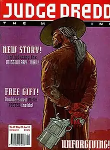 Missionary Man is British comic strip. It debuted in the Judge Dredd Megazine in May 1993 with the introductory 7-page story "Salvation At The Last Chance Saloon", illustrated by Frank Quitely. It established that tall Preacher Cain rides the Cursed Earth performing "special sermons" in the radiation-poisoned towns, tutoring the damned with a bible and his guns. In this first outing, having educated and decimated a table of gambling mutant heavyweights he rides into the sunset, tossing a bible at the surviving townspeople - which contains a thermonuclear explosive.