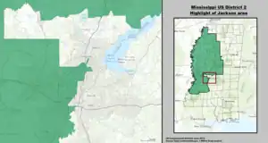 Mississippi's 2nd congressional district (MS-2) covers much of Western Mississippi. It includes most of Jackson, the riverfront cities of Greenville, Natchez and Vicksburg and the interior market cities of Clarksdale, Greenwood and Clinton. The district is approximately 275 miles (443 km) long, 180 miles (290 km) wide and borders the Mississippi River; it encompasses much of the Mississippi Delta, for a total of 28 counties plus parts of Hinds and Madison. It is the only majority-black district in the state. With a Cook Partisan Voting Index rating of D+11, it is also the only Democratic district in Mississippi.[2]