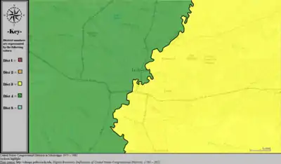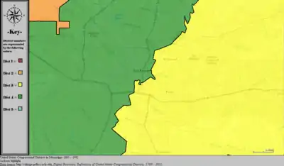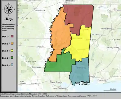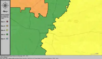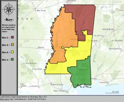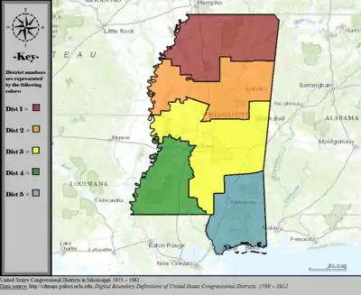 Table of United States congressional district boundary maps in the State of Mississippi, presented chronologically.[3] All redistricting events that took place in Mississippi between 1973 and 2013 are shown.