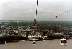 The system featured 53 separate cars, a 2,300 feet (700 m) cross-river cable, twin steel towers that lifted the cable 200 feet (61 m) into the air, two station houses, concrete pillars that anchored the cable and two 358 feet (109 m) steel towers.[4] Each of the two main towers were supported with 12-inch (300 mm) steel piles driven 285 feet (87 m) into the ground, with each tower weighing 200 short tons (180 t).[4] Its twin towers were the tallest ever constructed for a gondola lift at the time.[5] (The London Cable Car in the UK, built nearly three decades later, would exceed this former record by 50%.)