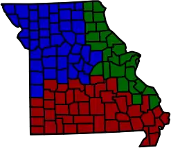 The Eastern District, in green, is based in St. Louis. The Western District, in blue, is based in Kansas City. The Southern District, in red, is based in Springfield.
