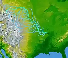 The Missouri River Valley outlines the journey of the Missouri River from its headwaters where the Madison, Jefferson and Gallatin Rivers flow together in Montana to its confluence with the Mississippi River in the State of Missouri. At 2,300 miles (3,700 km) long the valley drains one-sixth of the United States,[1] and is the longest river valley on the North American continent.[2][3] The valley in the Missouri River basin includes river bottoms and floodplains.