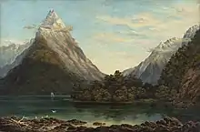 Mitre Peak is close to the shore of Milford Sound, in the Fiordland National Park in the southwestern South Island.[4] It rises to 5,560 feet (1,690 m) with almost sheer drops to the water. The peak is actually a closely grouped set of five peaks, although from most easily accessible viewpoints, it appears as a single point.[4] Milford Sound is part of Te Wahipounamu, a World Heritage Site as declared by UNESCO.[5] The imposing setting makes the peak a favourite object for painters.[6] A painting by Charles Decimus Barraud is held by the Sarjeant Gallery in Whanganui.[7]