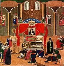 Mitrofan was buried in the Annunciation Monastery in the Tsar's presence in 1703. When 14 years later his tomb was opened, Mitrofan's body was found to be "whole" and his relics were proclaimed to have healing powers. After he was formally canonized in 1832 and Nicholas I paid a visit to his shrine,[3] his fame increased and large numbers of pilgrims from Central Russia started flocking to his tomb in Voronezh.[4] The first Moscow church in his name was consecrated in 1895.